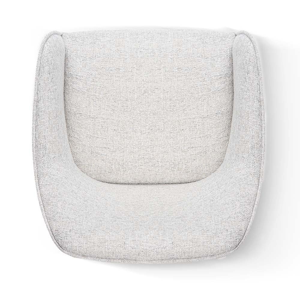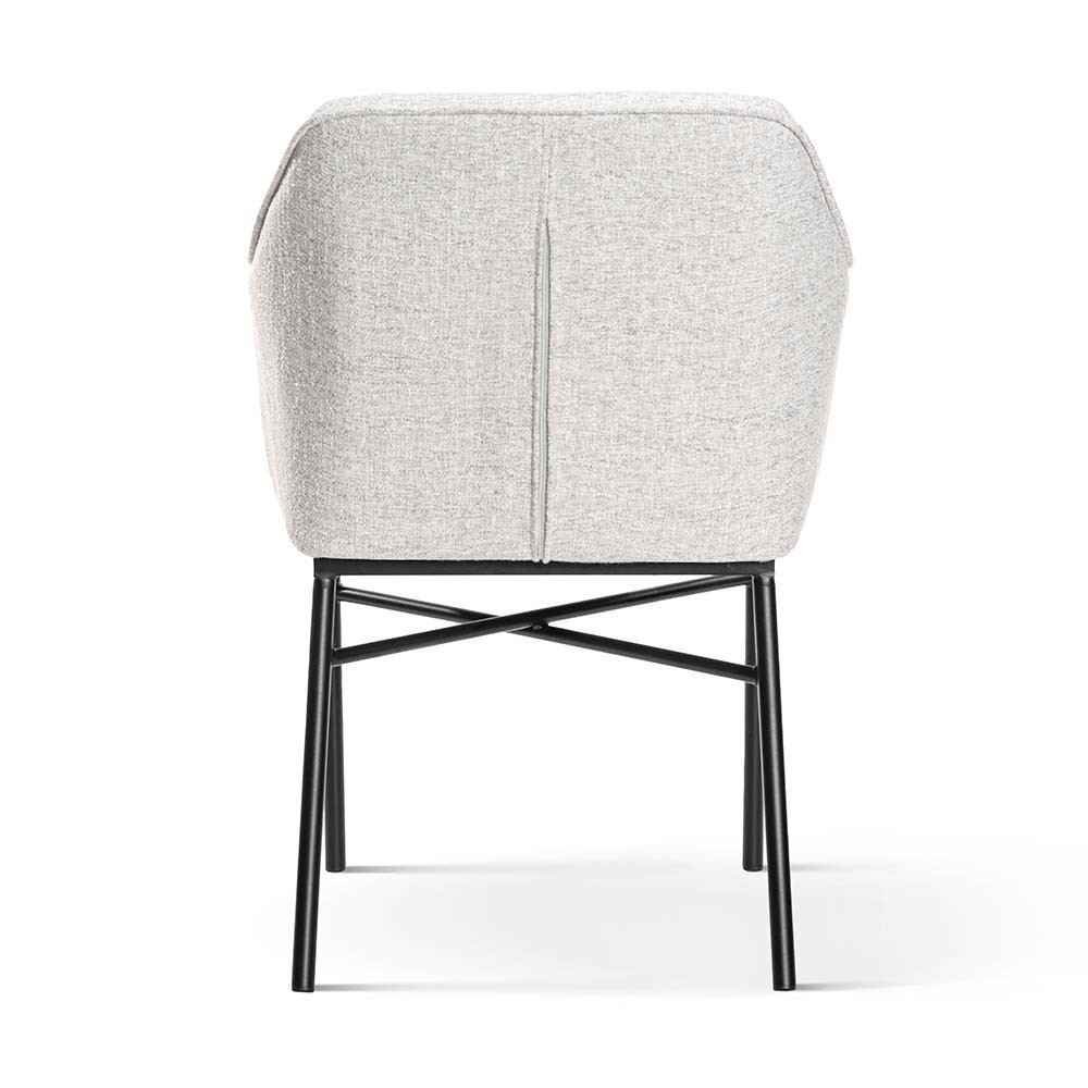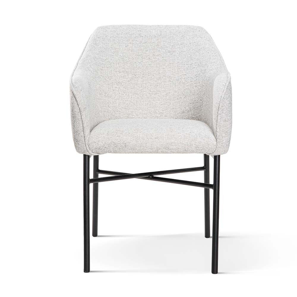 Het model onderscheidt zich door hoge armsteunen. De stoel is gemaakt met een houten frame en metalen poten.