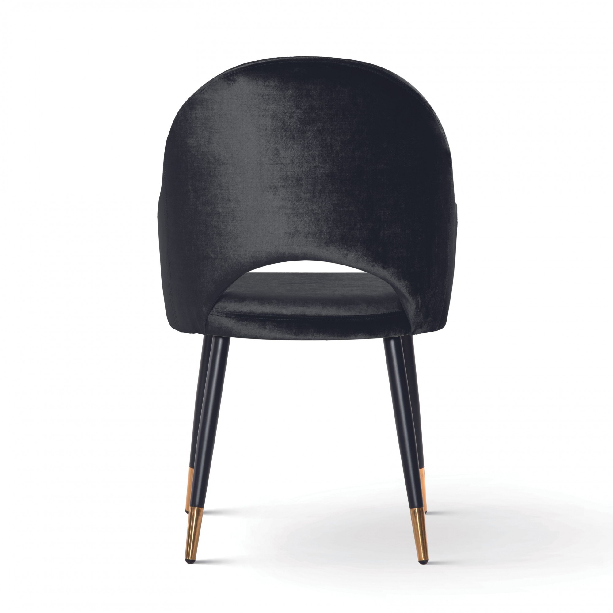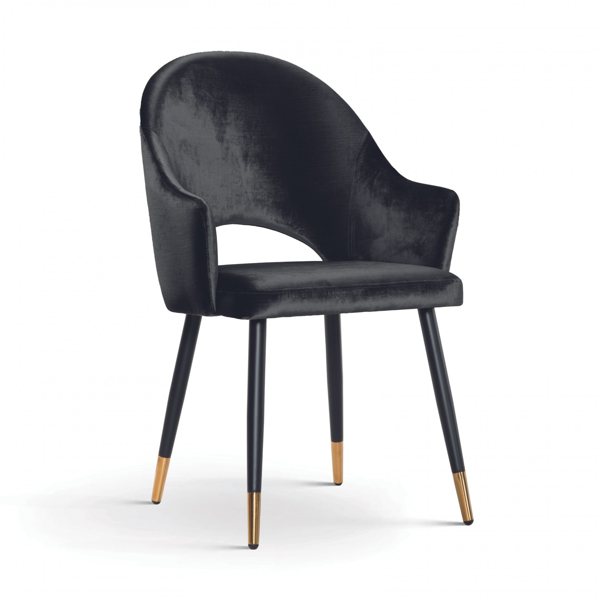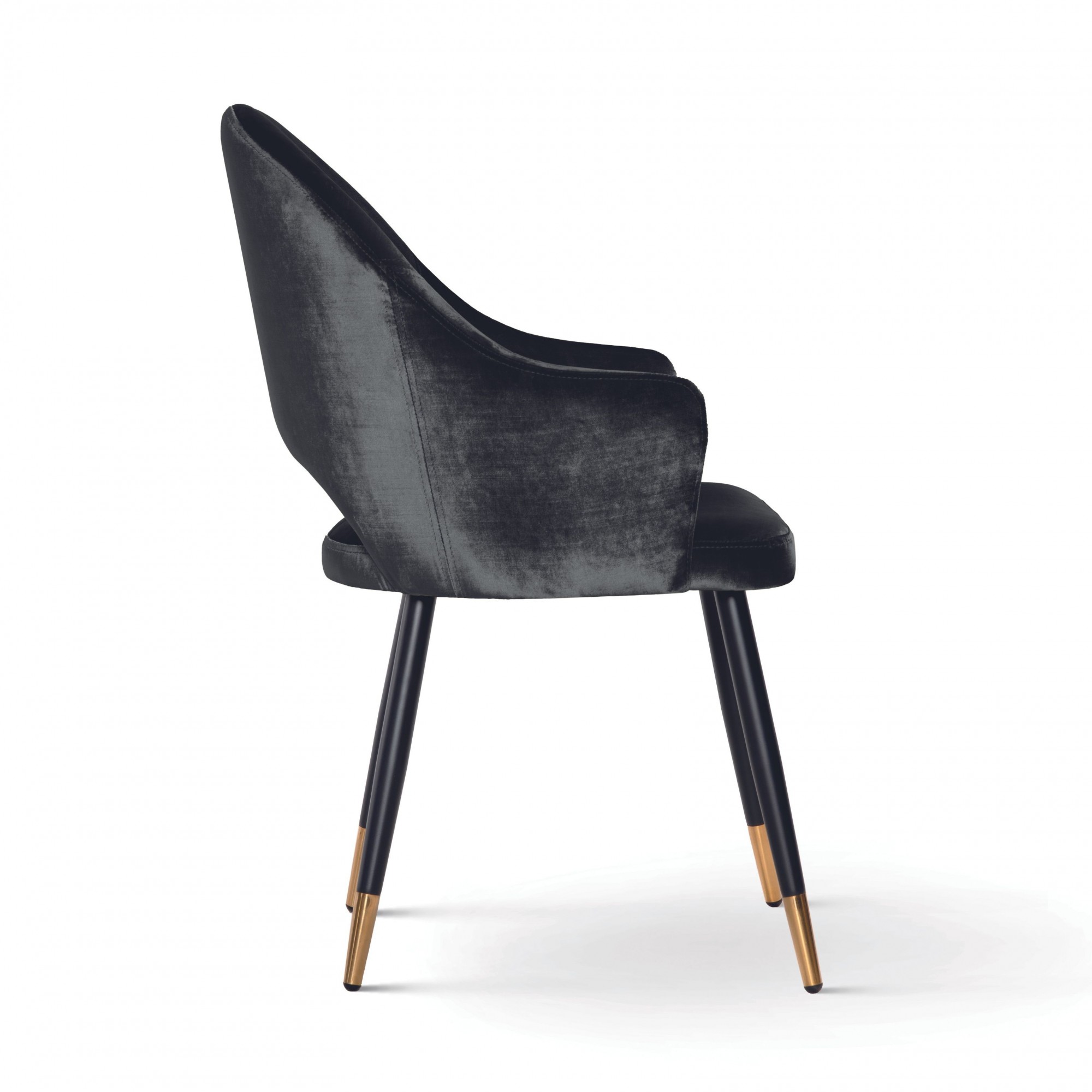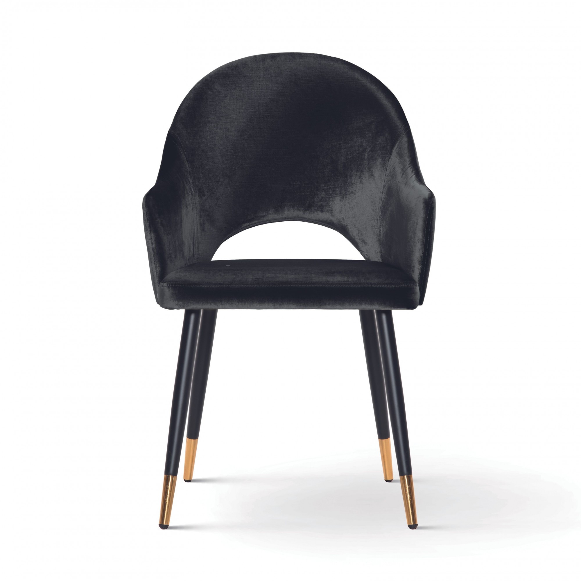 De stoel is gemaakt op een houten frame en metalen poten. Door het tijdloze design past de stoel, afhankelijk van de gekozen stof en de kleur van de poten, in elk interieur.